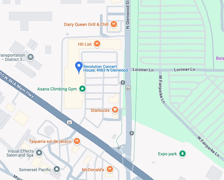 Revolution Concert House is located at 4983 GLENWOOD GARDEN CITY, ID 83714. Your favorite GPS or map making software will get you to the venue easy enough. Please give yourself plenty of time to arrive so you don’t miss the show.